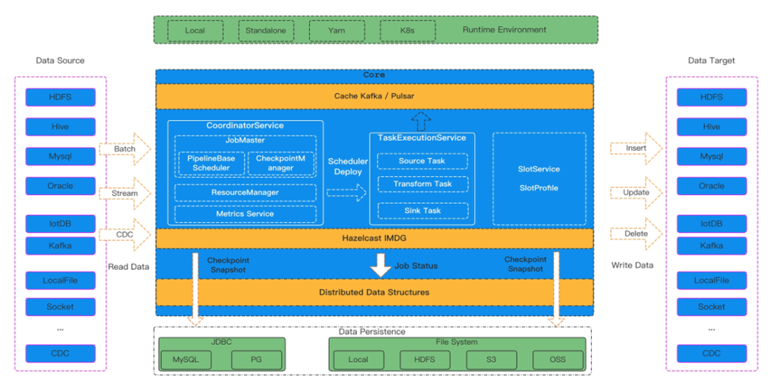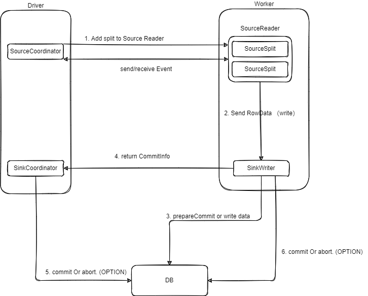 SourceCoordinator 负责发现Split以及协调SourceReader; SourceReader进行数据的实际读取,将数据发送到Transfrom转换后流转到SinkWriter; SinkWriter进行数据的实际写入,或者预提交后将提交信息发送给SinkCoordinator ; SinkAggregatedCommitter 负责协调SinkWriter,进行正式提交或触发中止; SinkWriter进行最终的提交或中止。