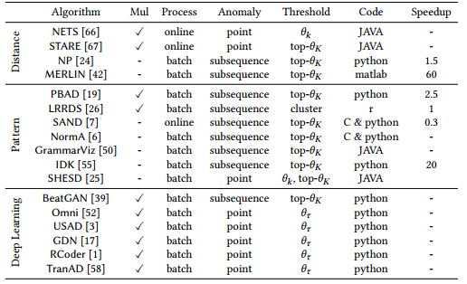 根据前文提出的分类体系,作者选择了每个子类中具有代表性的最新方法,按照“检测技术类型”(即距离、模式、深度学习)分类简要介绍这些方法,并提取它们的关键参数。表格中列出了每个算法的基本属性,包括支持的维度类型、处理方式、异常类型、阈值设置方式、原始代码语言以及加速实现效果。