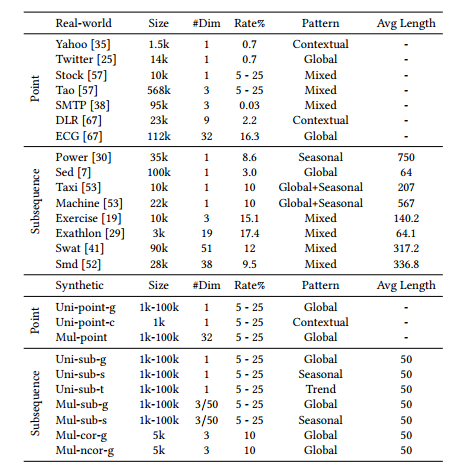 实验中采用了多个公开的真实数据集和合成数据集,共15个真实数据集与8类合成数据变体,涵盖点异常与子序列异常、多维与单维、各种异常率、长度与模式。合成数据基于正弦波生成,并注入不同类型的异常(全局、上下文、季节性、趋势)以满足标签不可靠场景下的研究需求。