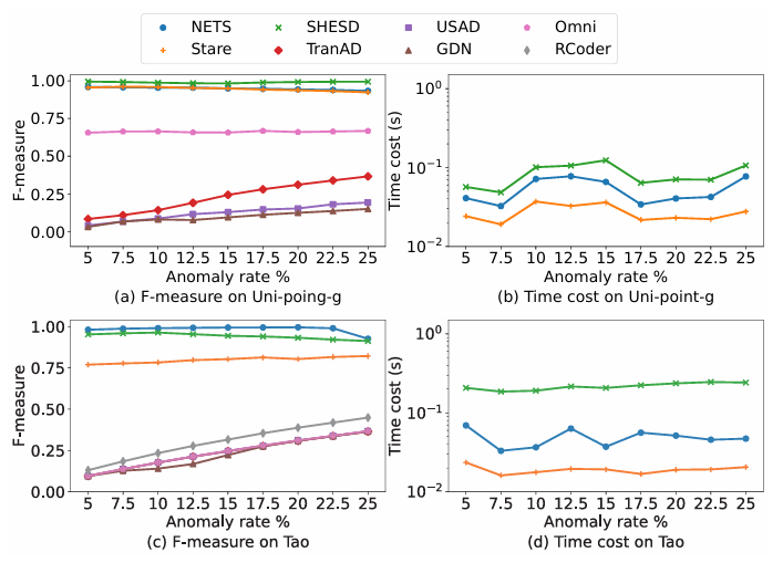 (1)点异常检测算法表现:实验结果表明,非深度方法(如NETS、STARE)在不同异常率下表现稳定。NETS在Tao数据集上表现稍弱,原因是当异常点与正常点邻居数相近时,难以设定合适阈值。部分深度方法(如TranAD、USAD、GDN)随着异常率上升而表现更佳,可能是因为其本身模型效果较差,预测出更多假阳性,恰好在高异常率下被“变为真阳性”。