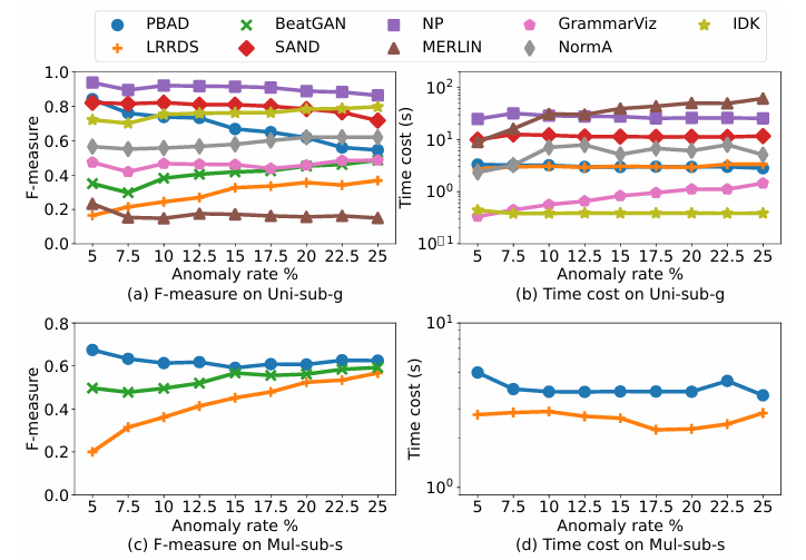 (2)子序列异常检测算法表现:实验结果可以看出,除MERLIN与GrammarViz外,大多数方法在不同异常率下运行时间基本稳定。准确性方面,PBAD等方法在低异常率时表现更好,而LRRDS与BeatGAN则在异常率高时更佳,这可能是由于减少了由异常点的粗略识别引起的误报。