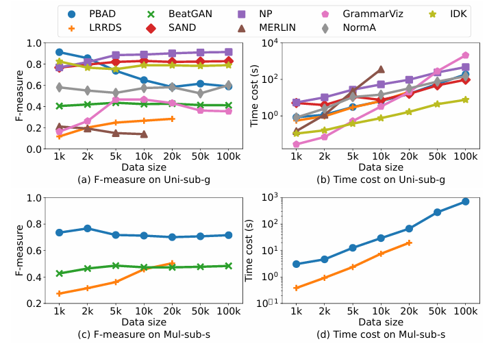 (2)子序列异常检测算法表现:实验观察到,在小规模(<10k)数据下,大部分基于模式的方法(如PBAD)性能波动较大,原因在于难以提取稳定的正常模式。数据足够大时,表现趋于稳定。MERLIN与LRRDS扩展性较差,大数据下耗时极长甚至内存溢出。