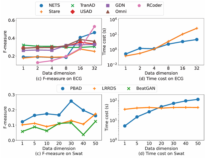高维数据场景:多维方法能利用维度间的相关性,从而提升检测准确率。但相较之下,单维方法因可在每个维度上并行处理,具有效率优势。实验表明,在处理51维的Swat数据集时,单维方法IDK耗时16.50秒,而多维方法PBAD耗时125.17秒,约为前者的10倍。此外,在高维数据中,LSTM等模型的性能也会显著下降。因此,评估在多维数据中使用单维模型的可行性尤为重要。