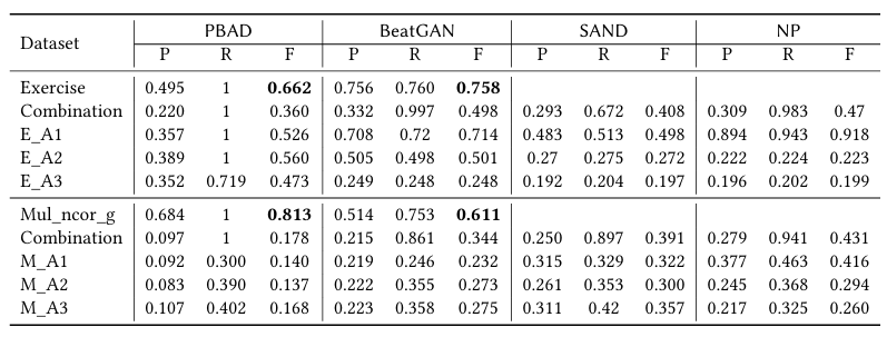可以看出,对于不同的数据集,不存在万能的算法,每种方法适用于特定场景。总体来说,NETS参数调优后表现优异,PBAD与BeatGAN综合准确率高但耗时更多,而深度学习方法在复杂模式数据上优势不明显。