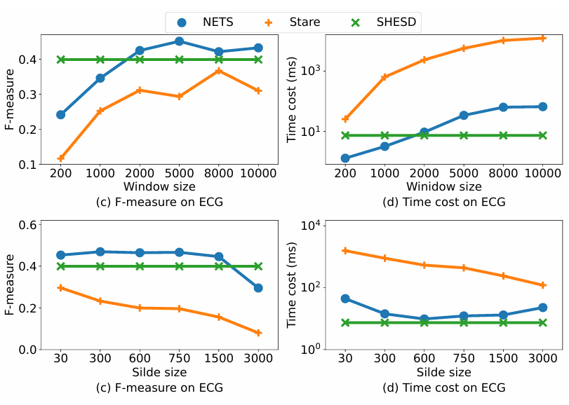 实验对NETS与STARE两种算法在不同窗口、滑动步长下的表现进行分析(以ECG为例),并与批处理方法SHESD进行对比。实验结果表明,若窗口过小,正常点缺少足够的邻居,误报增多;若窗口过大,局部异常点的相邻点的数量可能超过预定义阈值,漏报增多。但是存在一个合理窗口范围来平衡精度与效率。