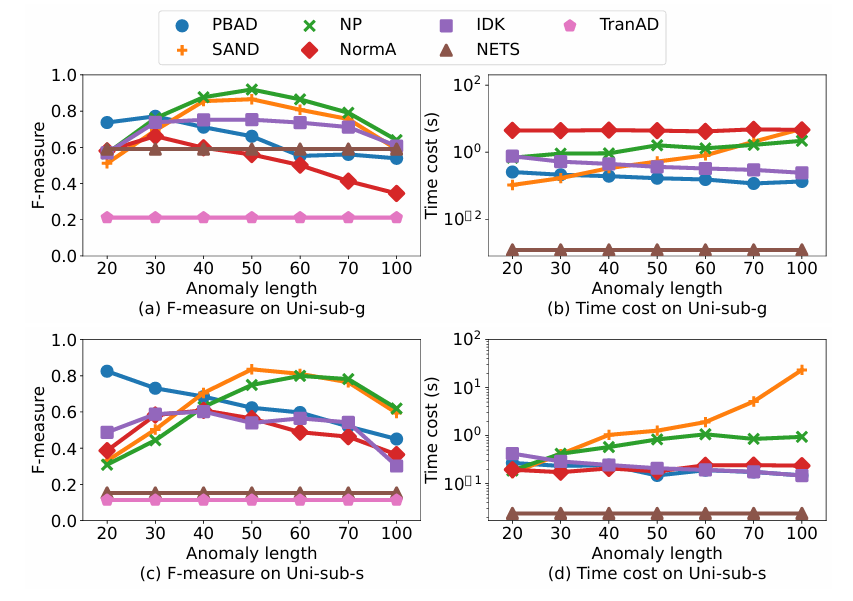 子序列异常检测算法总是将异常长度作为输入参数。相反,点异常检测算法不需要这样的输入(长度为1)。为了了解异常长度的影响,实验中使用注入全局异常和季节性异常的单维数据来避免维度的影响。实验结果表明,点异常检测算法对异常长度具有敏感性。对于全局异常和季节性异常,当异常长度为50时,NP和SAND可以表现出很好的性能,而PBAD和NormA性能随着异常长度的增加而衰减。同时,NETS在两种异常的时间成本很少。实验表明点异常检测算法也可以很好地处理全局子序列异常。