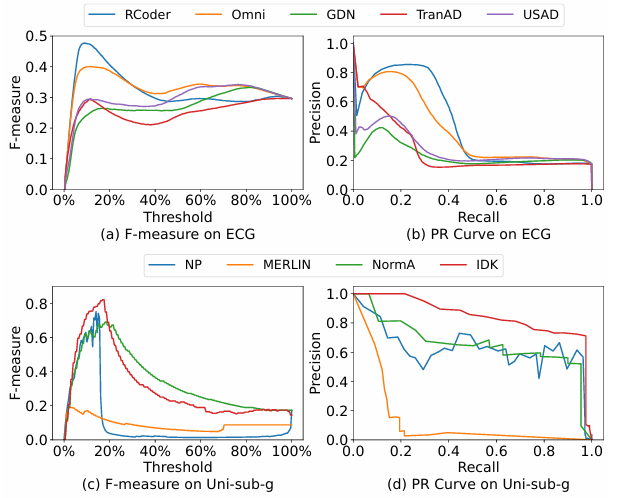 实验中尝试多种阈值设定方式,对比不同算法在固定与动态阈值下的表现。结果显示,一些方法对阈值设定极度敏感。使用动态阈值的算法如GDN、USAD在不当参数下精度急剧下降。作者此处建议使用数据驱动的阈值选择策略进行调整。