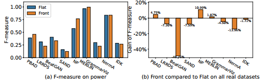 实验中还讨论了两个现实应用中的异常检测。场景1:某些应用对积极的结果更感兴趣,例如癌症检测。某些应用对消极的结果更感兴趣,例如识别垃圾邮件。场景2:在之前的研究中,实验假设离群值范围的所有位置都同样重要。在现实场景中,癌症检测和实时系统对于早期响应的要求比较高。对于场景1,实验在所有的真实数据集上使用点异常检测算法和子序列异常检测算法,在场景2上使用子序列异常检测算法。实验结果中Flat指标表示所有位置具有相同分数的度量,而Front指标表示为子序列异常的早期位置分配更多权重