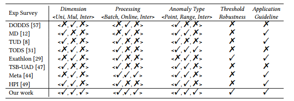 作者在相关工作中总结8个先前关于时序数据中异常检测的实验研究,与本文的工作进行了对比。表格中前三列表示研究中涵盖的基本方面,比如在数据维度中包括单维,多维,单维和多维方法之间的比较;处理技术中包括了批处理,实时检测和两种方法之间的比较;异常类型则包括了点异常,子序列异常和两者之间的比较。同时,研究还包含了对阈值鲁棒性和应用指南方面的比较。整体的相关工作比较如下: