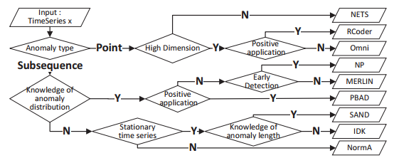 在统计学与计算机科学领域,时序数据中的异常检测已被研究了数十年,涵盖如欺诈检测、环境监测、工业制造、医疗健康等多种应用场景。虽然当前已有众多算法针对不同场景提出,但由于缺乏统一测试环境、标准化数据集和评价指标,导致用户在实际应用中难以选择合适的方法。作者从“数据维度”、“处理方式”和“异常类型”三大核心特征出发,构建了一套系统的分类体系,并在该体系下将17种最先进的算法划分为六个子类。实验中在真实与合成数据集上使用点异常评估指标(point metric)与针对子序列异常设计的子序列(范围)指标(range metric),对算法进行系统性地类内比较(intra-class)与类间比较(inter-class)。从效果、效率与鲁棒性多个维度出发,分析了这些算法在异常比例、数据规模、维度数量、异常模式与阈值设置等条件下的表现。最后,作者基于不同的使用场景对这些算法进行深入分析,并提出一套面向实际应用的异常检测算法选择指南。