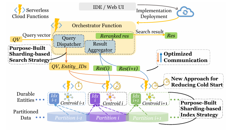 图中Vexless采用了多种技术来管理和搜索大量向量数据。黄色闪电符号表示在Vexless中使用的云函数,例如持久实体函数和编排器函数等。这样的分布式搜索架构通过分片解决了数据分发问题,利用云函数作为计算单元,并通过改进的通信协议加速分布式搜索过程。