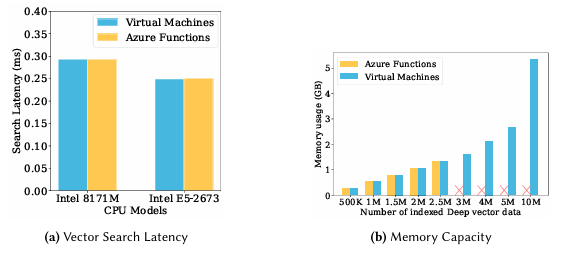 云函数是为轻量级任务构建的,通常资源非常有限(CPU、内存、磁盘存储等)。比如云函数的代表Azure Functions每个实例的最大内存限制为1.5 GB。如图所示在Azure CF内存限制内,当使用相同的CPU配置时,其向量搜索计算延迟与虚拟机保持相同。但是对特定数量的索引向量的内存使用情况,Azure Functions无法容纳指定数量的向量的数据索引。