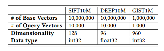 实验使用了三个在ANN研究中常用的数据集:第一个向量数据集是SIFT10M。尺度不变特征变换(SIFT)是一种著名的计算机视觉算法,用于识别和概述图像中的局部特征;第二个数据集是DEEP10M,由1000万个96维L2归一化的浮点向量组成,称为深度描述符;第三个数据集ANN_GIST1M(GIST1M),包含100万个GIST特征向量,这些特征向量封装了图像的全局属性,包括颜色、纹理和空间结构。