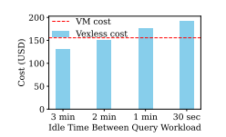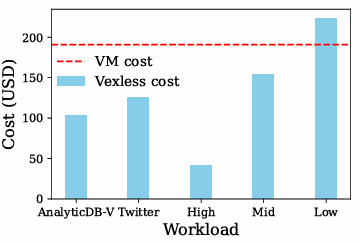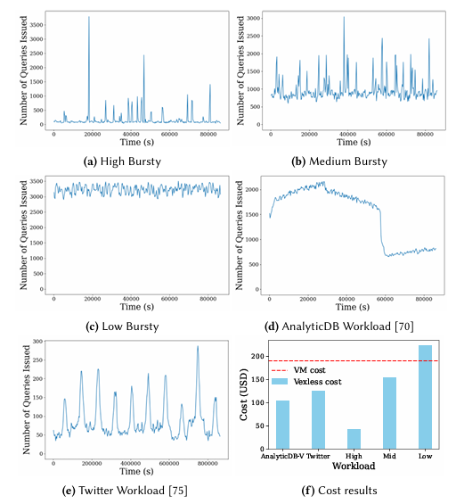 云函数适用于稀疏和突发的工作负载。相比之下,虚拟机更适合于具有稳定,可预测和广泛查询的连续工作负载,因此虚拟机中的资源利用率始终很高。考虑到虚拟机比每资源单位的云函数更便宜,虚拟机的整体成本也会更低。