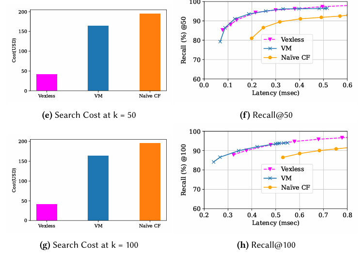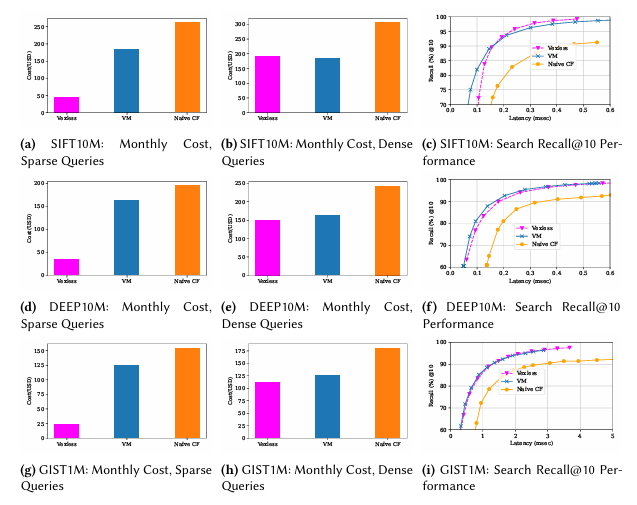 Vexless在不同数据集的性能成本比和延迟结果。前两列显示了在稀疏和密集工作负载下使用不同实现的相同参数进行向量搜索的每月成本;右列显示了召回延迟结果