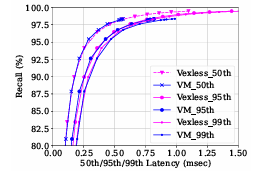 此外,Vexless在三个不同的数据集上实现了最佳搜索性能,这体现在它的召回率都高于虚拟机和原始云函数的解决方法。这证明了Vexless极佳的成本效益。它优化分配无服务器资源,以确保最佳搜索性能和成本效益的结果。