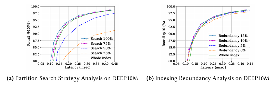 Vexless的搜索策略在不同函数激活级别中具有很强的搜索性能。实验将DEEP10M数据索引分布在四个分区上,然后通过将搜索任务分派到与顶部p(p= 100%、75%、50%、25%)最接近的索引分区,并激活它们以进行一次查询搜索。"whole index"表示HNSW索引,即云虚拟机(VM)上运行向量搜索。实验表明,通过搜索更多的索引分区,由于更大的搜索范围,导致性能更好。同时,搜索前75%最接近的索引分区不仅节省了1/4的搜索开销,而且搜索性能与前100%搜索策略相当。另一方面,对比Vexless的向量数据分片策略中在DEEP10M等数据集上的搜索效率,如图所示,在索引相同内容时,引入冗余边界向量会增加的总体内存消耗。