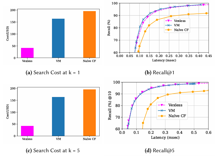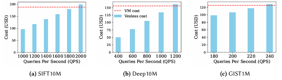 通过来评估以不同qps速率连续发出查询的成本,实验表明,对于Deep10M数据集,只要连续查询速率低于1000 qps(中等网站的查询速率),云函数会比VM更加。