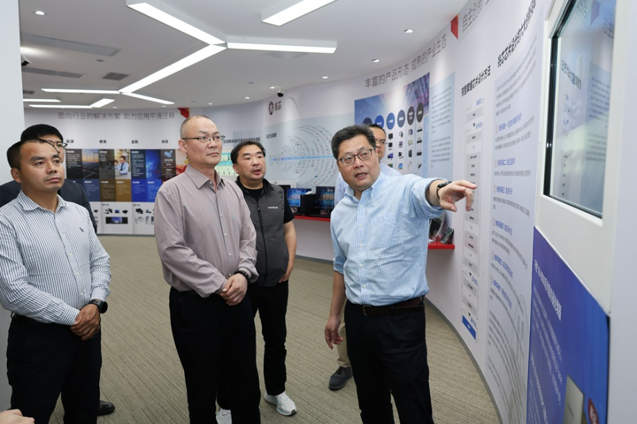 卢振宇一行首先参观了创新成果展厅,深入了解兆芯公司的发展进程、市场化成果与典型案例,以及兆芯在自主通用处理器领域取得的核心技术突破。作为国内为数不多具备 CPU 全栈自主研发能力的企业,兆芯凭借持续不断的技术创新,构建了完整的知识产权体系,产品覆盖云、边、端全场景应用,为国家信息安全和数字经济高质量发展提供了坚实的底层支撑。