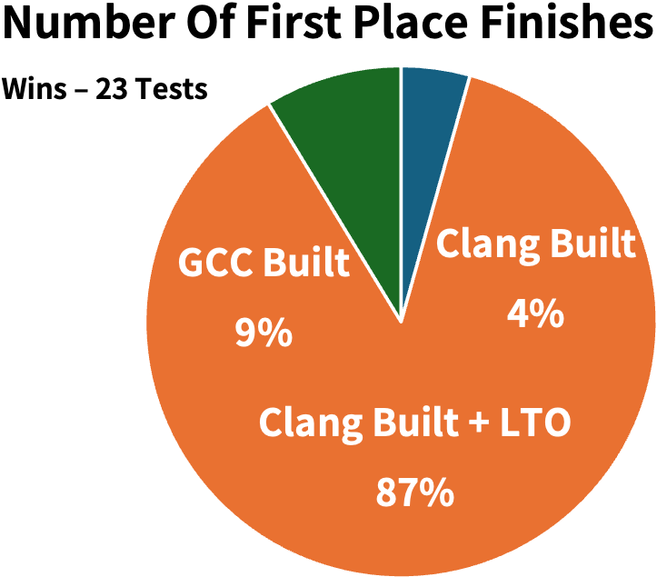 Phoronix (2023-06) : Clang16 vs GCC13 @ Epyc Gen4 [1] Clang 16 在 131 个用例中 75 个性能领先 GCC 13.1,原始数据均值领先 4% Phoronix (2021-07}:Linux Kernel, Clang12 (+LTO) vs GCC11 [2] Clang12 (+LTO)在 23 个用例中 20 个领先,原始数据均值领先 9
