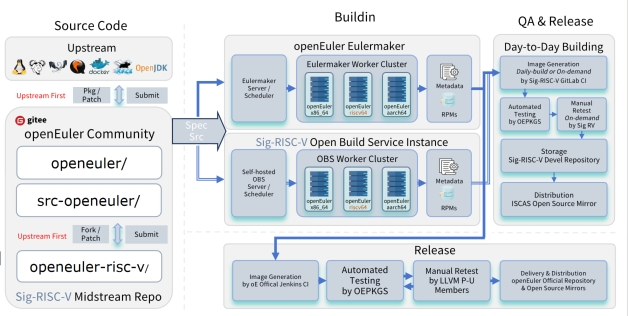 发版时:Eulermaker构建->社区 JenkinsCI服务制作镜像 ->OEPKGS平台多次自动化测试及手动补测->多重审批 ->对外发布