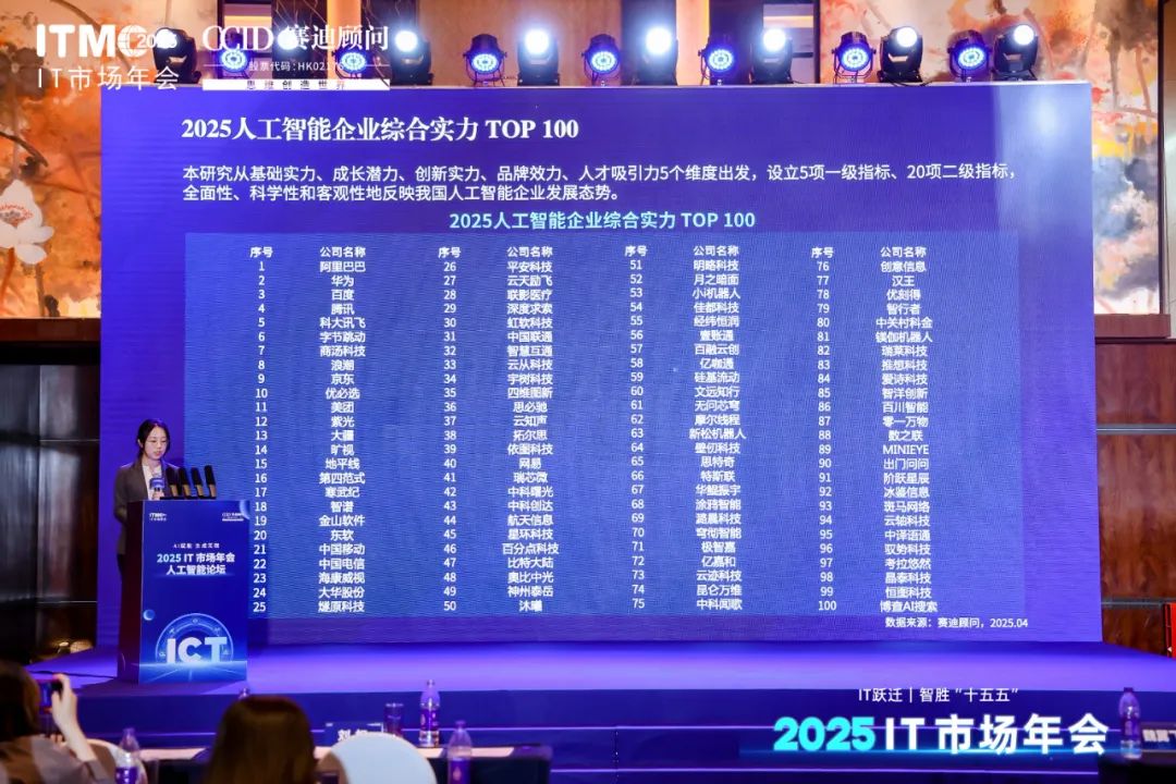 为精准把握中国人工智能企业在该领域内的竞争力构建与发展潜力,赛迪顾问通过《中国人工智能企业竞争力研究(2025)》调研工作,全面评估和公正评选出中国在人工智能领域表现卓越、技术领先及市场影响力显著的中国人工智能百强企业。本次评选从基础实力、成长潜力、创新实力、品牌效力、人才吸引5个维度出发,全面、科学、客观地反映中国人工智能企业发展态势。