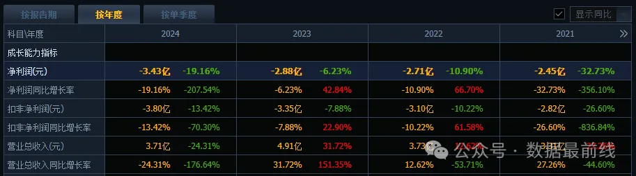 但是其上市之后的成绩并不亮眼,最近发布的2024年报显示净利润亏损-3.43亿,相比2023年的-2.88亿,同比亏损增加19.16%,企业营收能力并没有随着上市而增长。