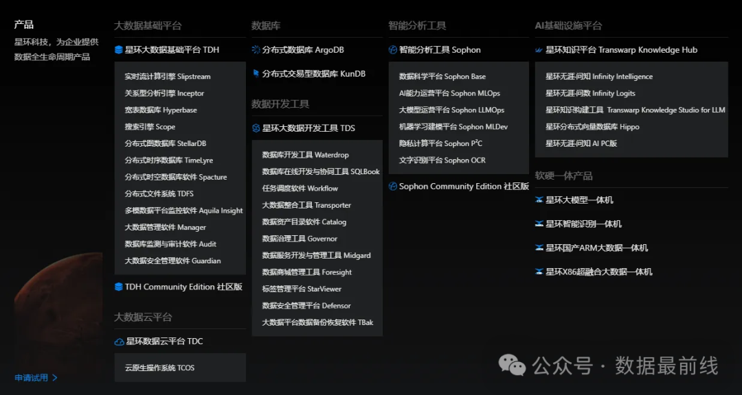 星环科技成立于2013年,是一家致力于打造企业级大数据和人工智能软件的高科技公司,围绕数据的集成、存储、治理、建模、分析、挖掘和流通等数据全生命周期提供基础软件与服务。经过多年自主研发,公司已形成大数据与云基础平台(TDH & TDC)、分布式数据库(ArgoDB)、数据开发与智能分析工具(TDS & Sophon)、知识平台与大模型运营平台(TKH & LLMOps)的软件产品矩阵,公司产品已经在十几个行业应用落地,拥有超过1500家终端用户。