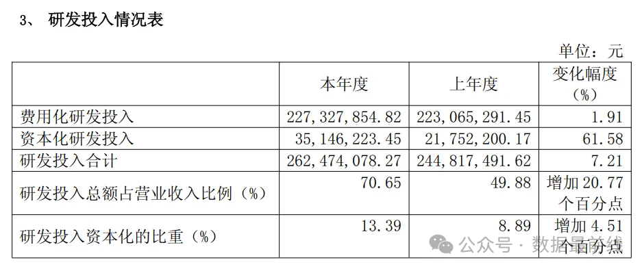 庞大的产品线也带来了庞大的研发成本,2024年报中披露的研发投入高达2.6亿,竟然占到了公司营业收入的70%+,比上年度激增22%。其中资本化研发投入仅占总投入的15%,说明企业研发项目多处于探索或早期开发阶段,相关支出难以满足资本化条件。而且这么高的研发占比,能持续投入多久值得商榷。