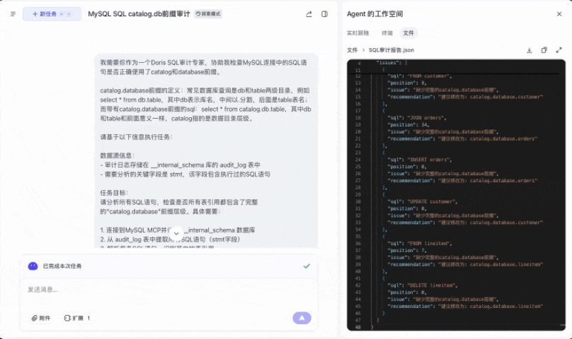 通过Doris SQL审计和几个小场景的验证,我们看到扣子空间+MCP的组合展现出了一定潜力,但也存在明显局限 - 有些检测结果存在"无中生有