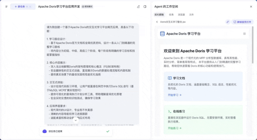 请为我创建一个基于Apache Doris的交互式学习平台网页应用,具备以下功能: