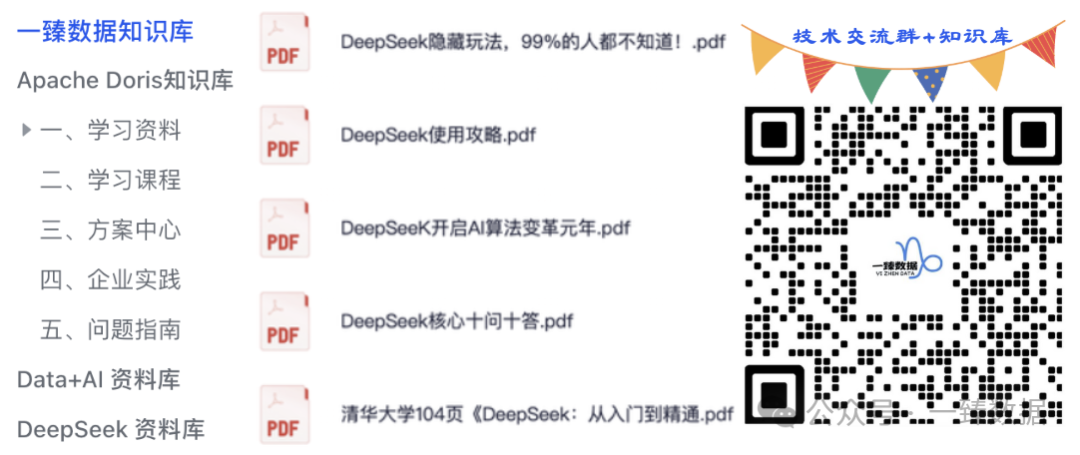 另外,整理了份 一臻数据知识库 ,其中包含 Apache Doris和 Data+AI 的学习资料、学习课程、白皮书、研究报告、行业标准 和 实践指南 等内容,会持续更新,欢迎关注公众号,免费领取。