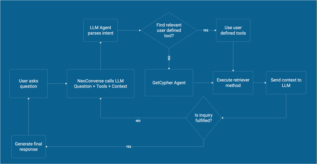 1. 用户用简单的英语提问。 2. LLM 解析意图并检查是否有任何用户定义的 agent 适用。 3. 如果有一个专门的 agent 可用,NeoConverse 将执行相应的工具。否则,它将回退到 GetCypher 工具以生成 Text2Cypher。 4. 检索到的上下文将发送回 LLM,后者将编译最终答案。 5. NeoConverse 向用户返回一个有根据的、数据支持的响应。