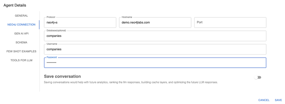 2. Neo4j 连接:配置 Neo4j 连接详细信息以进行对话。