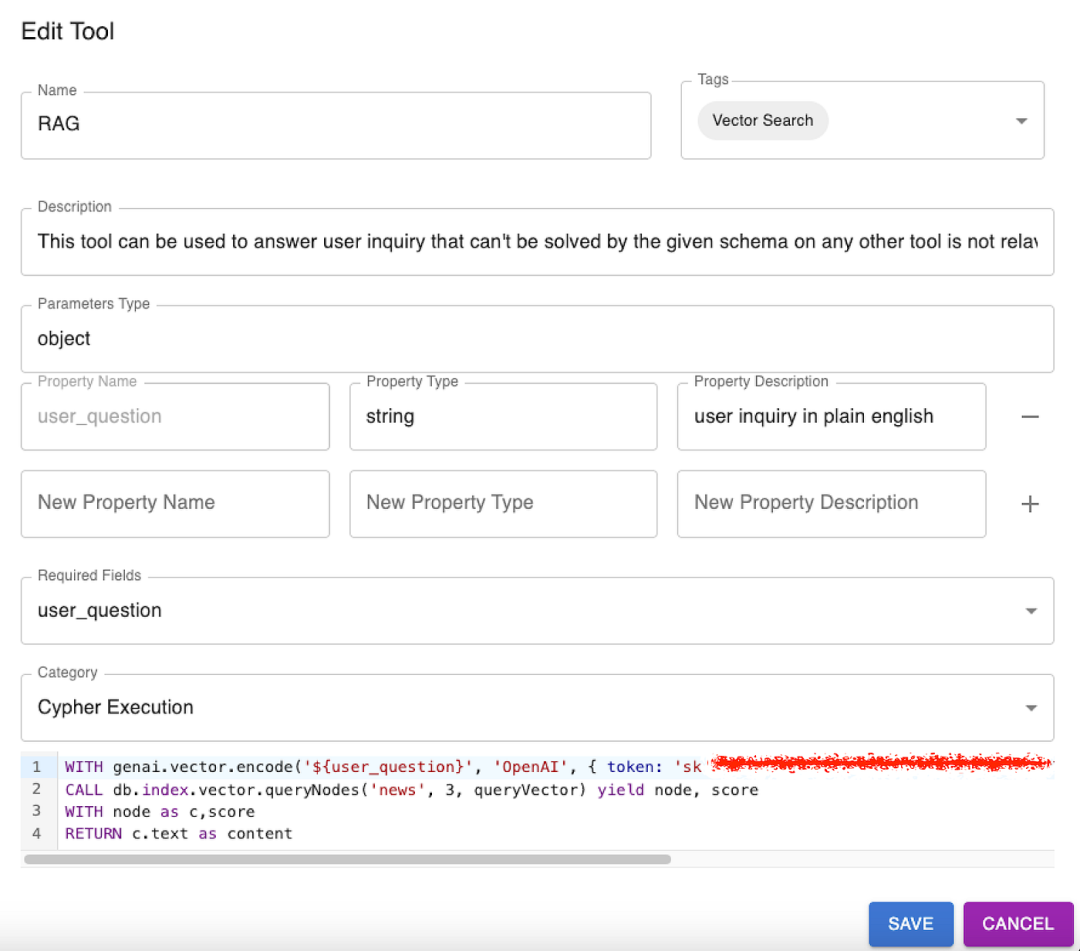 此 RAG 工具中使用的 Cypher 查询对 Neo4j 向量索引(新闻)执行语义搜索,以根据用户的问题查找最相关的新闻文章: