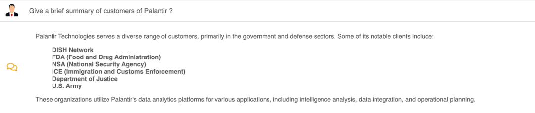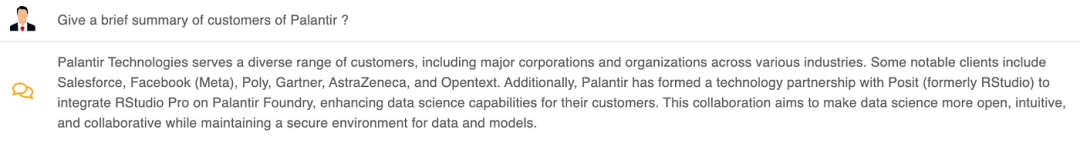 为了验证 GraphRAG 在处理实体关系方面的优势,我们选择了以下问题: “简要概述 Palantir 的客户。” 在本实验中,我们将对比两种检索方法的表现,以评估它们在实体关系至关重要的场景下的准确性差异。