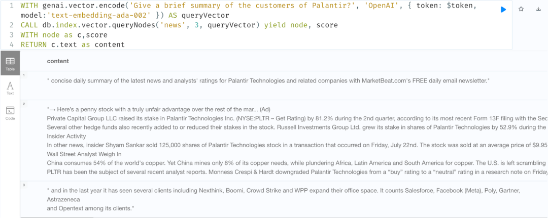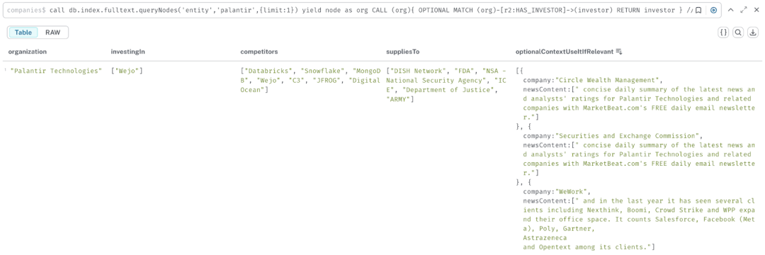 此 Cypher 查询检索 Palantir 的关键关系,同时执行语义新闻搜索以提供其他上下文。