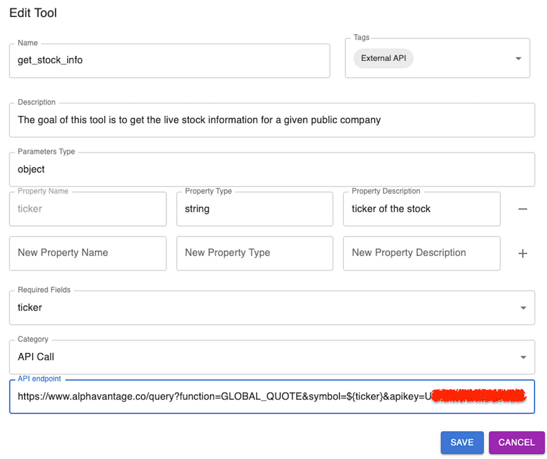 为了实现这一点,我们在 NeoConverse 中创建了一个工具。同样,可以将工具视为 AI 可以调用以执行特定任务的专用函数。在本例中,我们的工具名为“get_stock_info”,它使用外部 API 检索给定公司股票代码的实时股票数据。