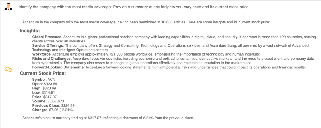 同时,协调器将埃森哲的股票代码(“ACN”)交给股票工具,检索最新的市场数据。