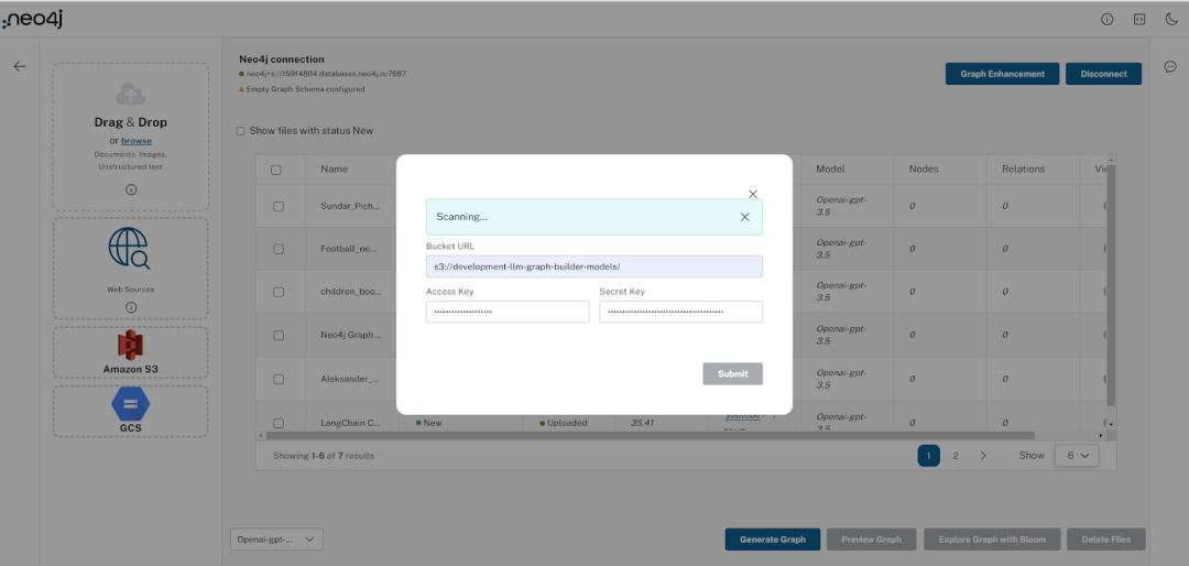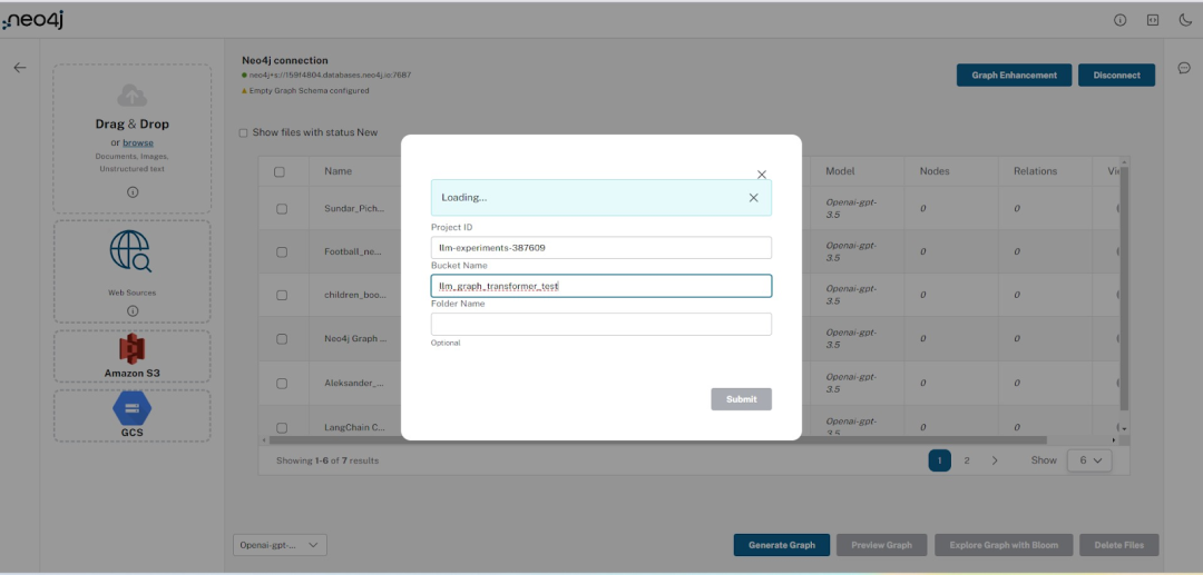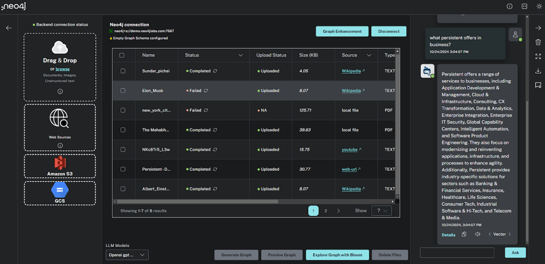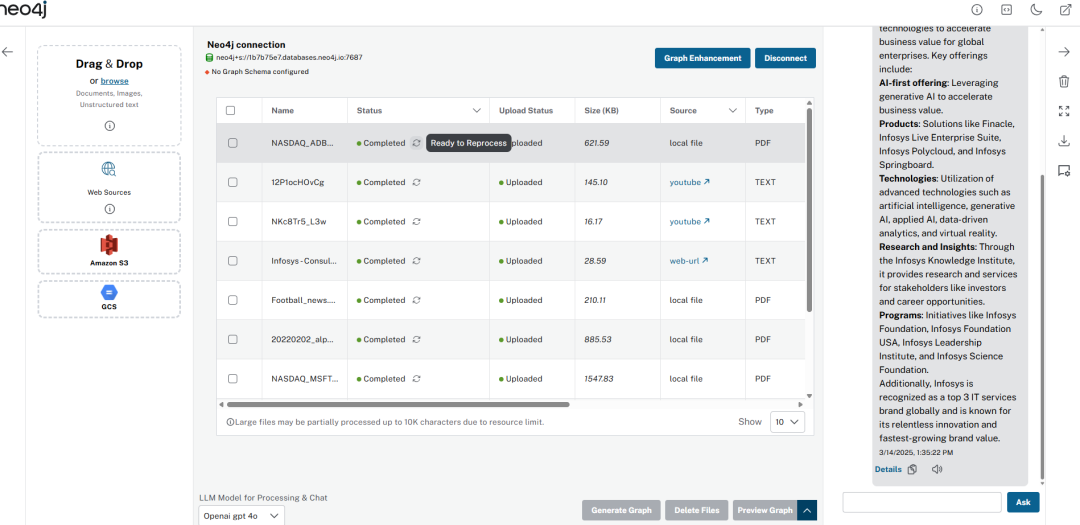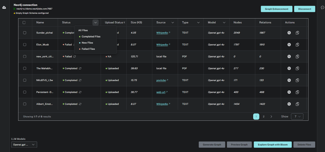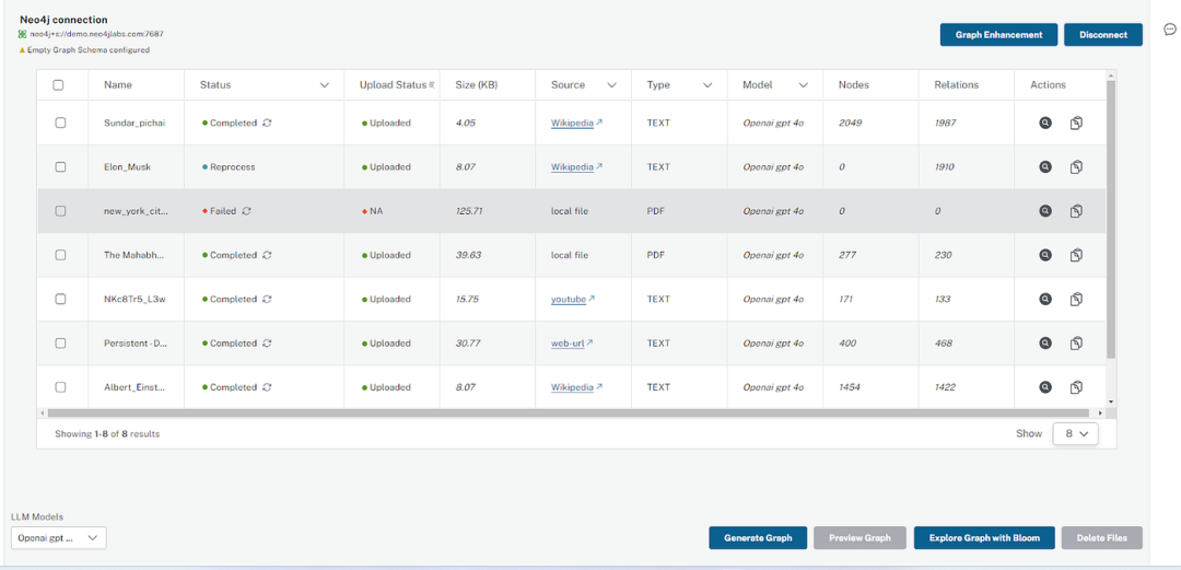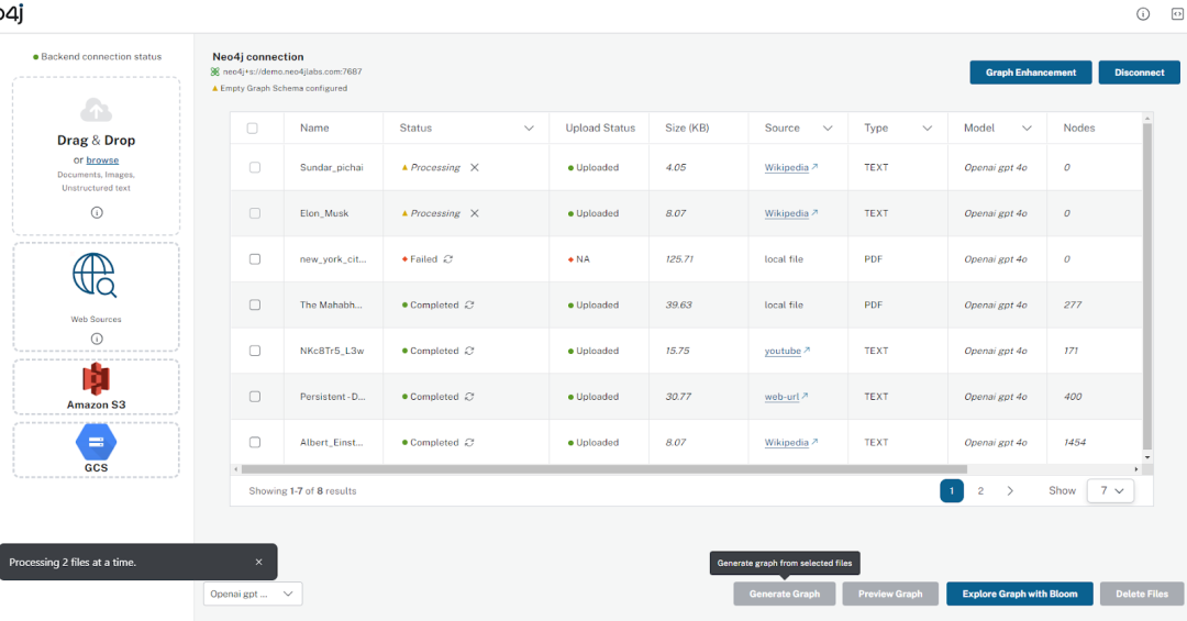 要处理文档,用户需要单击“生成图”按钮,该按钮使用 LangChain 中的 LLM Graph Transformer(https://medium.com/towards-data-science/building-knowledge-graphs-with-llm-graph-transformer-a91045c49b59) 工具启动提取过程。所选文件或处于新状态的文件将进入处理状态,若无失败则进入完成状态。