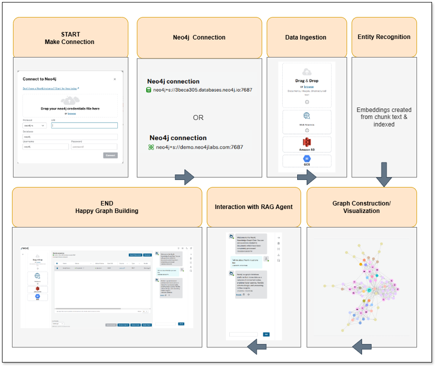在上一步中识别的实体和关系用于在 Neo4j 数据库中构建知识图谱。这包括确定构成图数据库的节点(实体)和边(关系)。