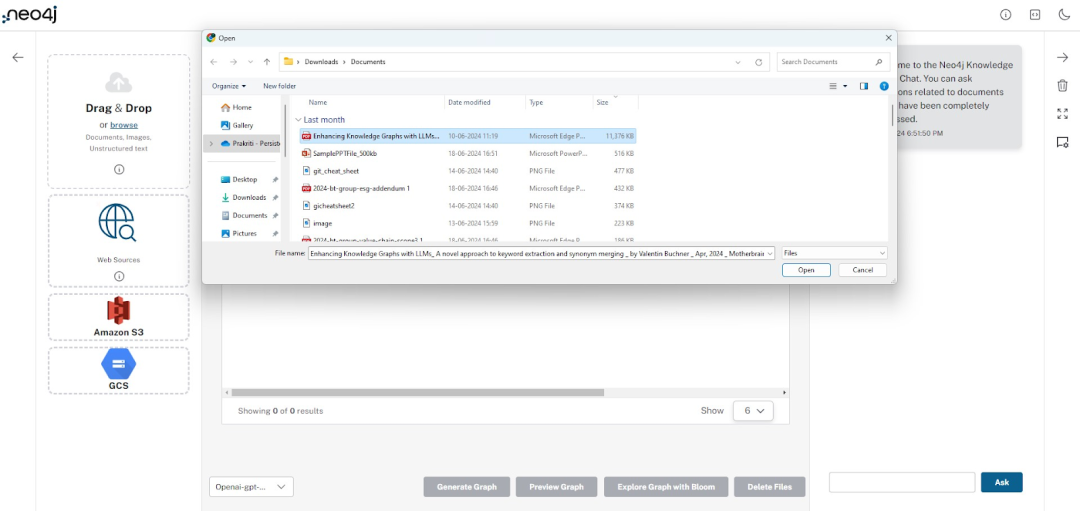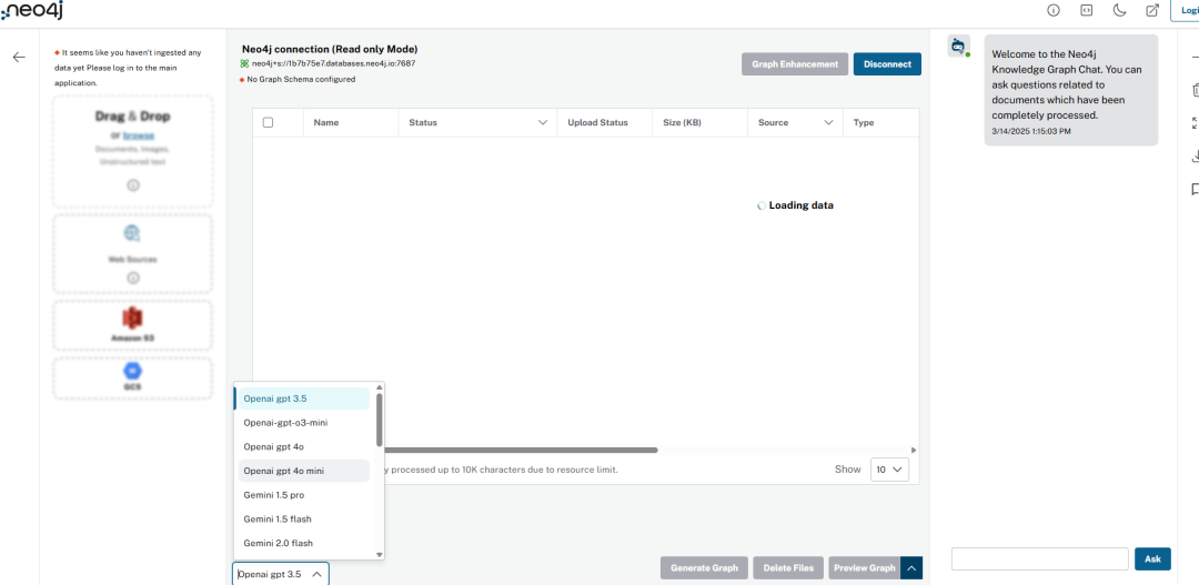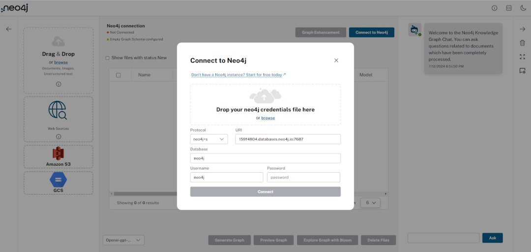 用户友好的界面引导用户连接到 Neo4j Aura、访问文件源、上传 PDF 文件、生成图、可视化图以及聊天界面: