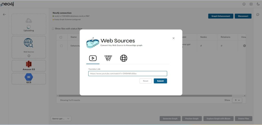实体提取:用户可以选择提供自定义模式,使用现有的模式示例,或者加载 Neo4j 数据库的当前模式。