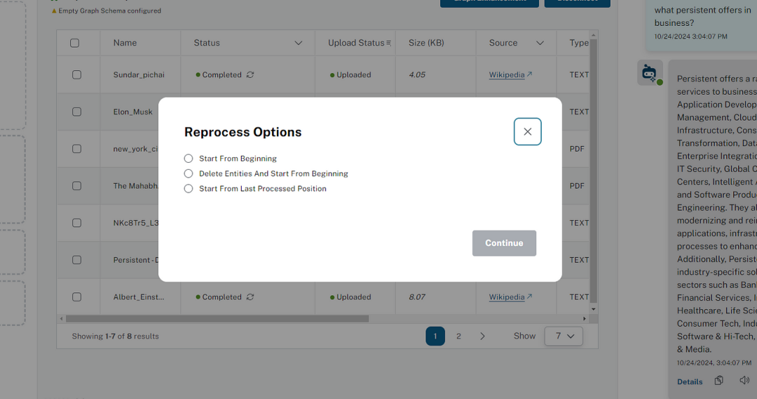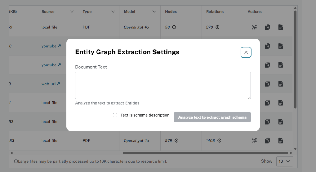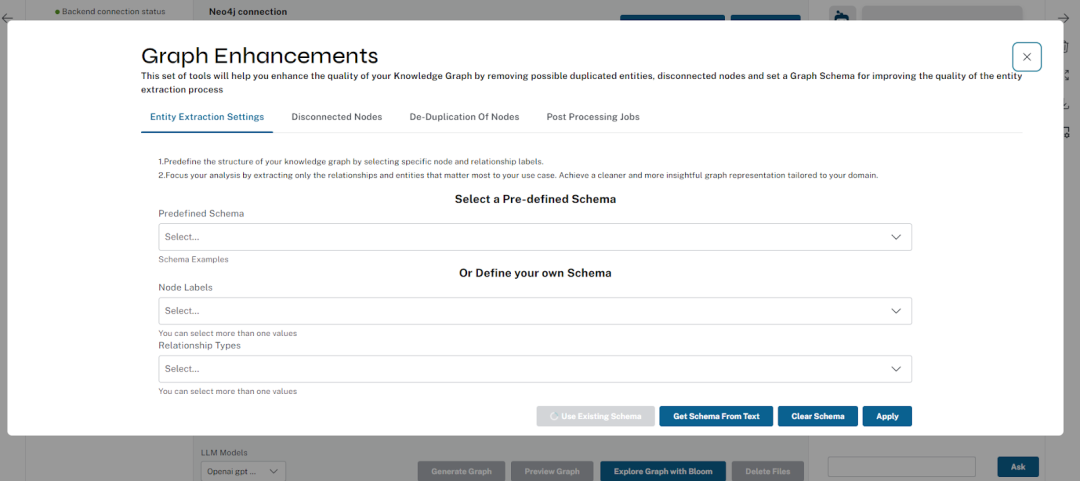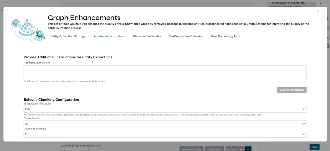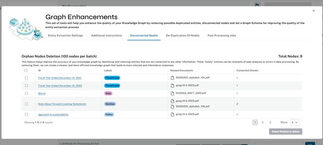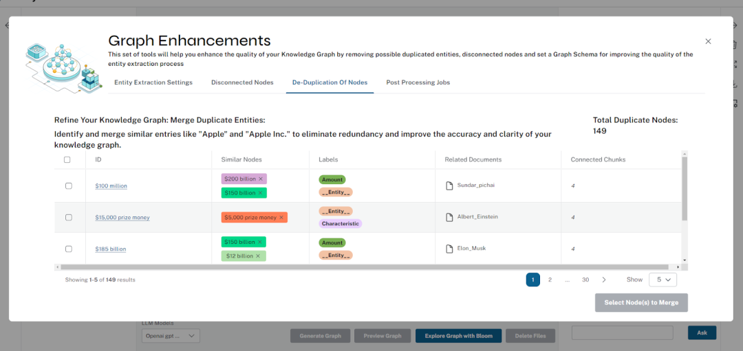 我们支持许多处理增强功能,用户可以配置设置,例如为提取设置自定义图模式、获取用于引导提取的其他说明、以交互方式删除孤立节点、合并重复节点(按相似度)。