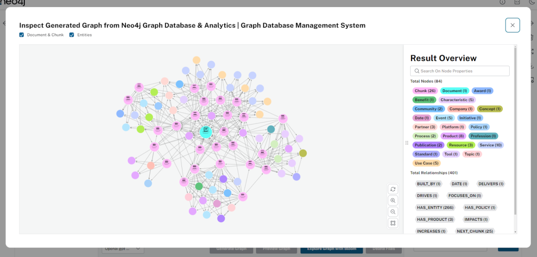 • 文档和块 - 显示文档和文本块之间的连接 • 实体图 - 显示已识别实体之间的关系 • 社区 - 显示实体集群的社区摘要 • 用户还可以使用 Neo4j Bloom 探索该图,以进行更高级的分析、查询和编辑
