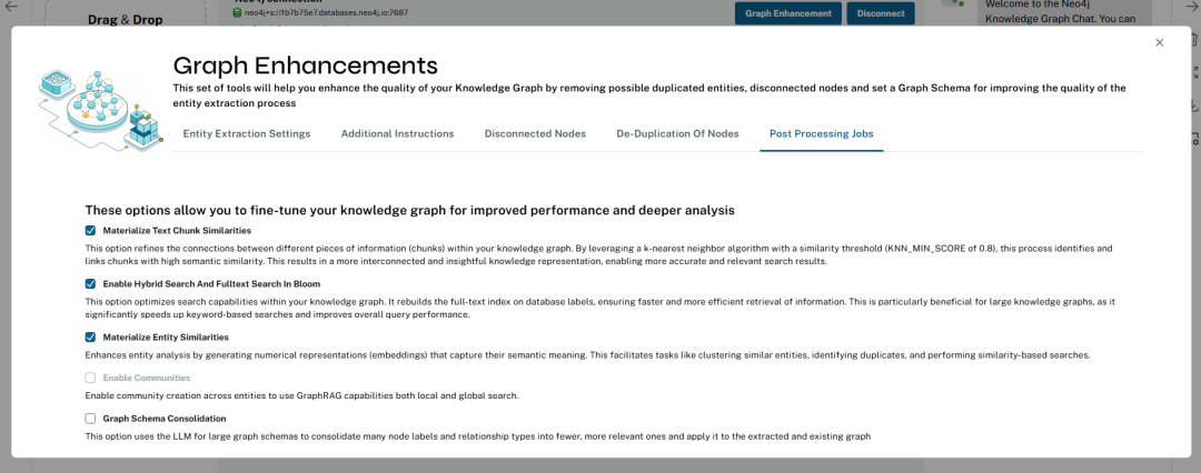 后处理作业:用户可以选择在提取过程之后可以运行哪些作业,这将开箱即用地改进 GraphRAG 等功能。无论是 Graph Data Science (GDS) 实例还是非 GDS 实例,我们都支持社区选项,包括以下功能: