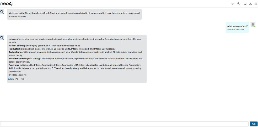我们支持聊天答案的可解释性,这允许用户验证从图数据库检索的并由 LLM 用于生成答案的实际答案来源和实体。