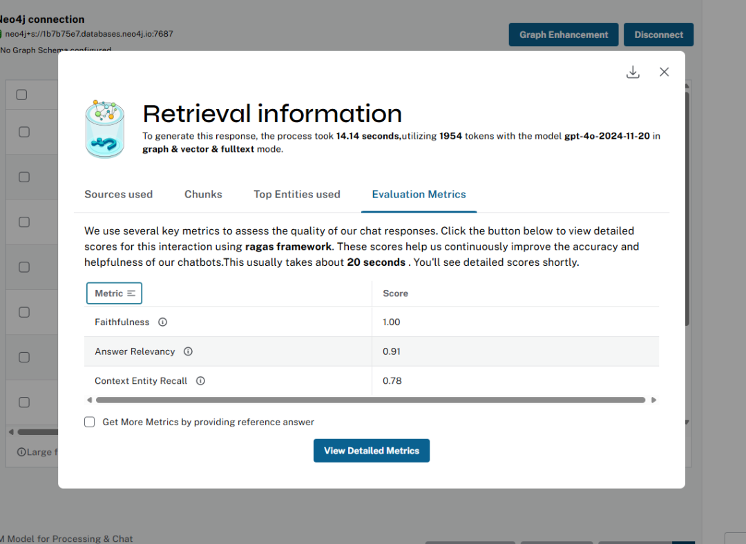 您可以通过单击“详细信息”来查看它们。在弹出窗口中,我们不仅显示有关检索模式、模型、令牌和运行时的信息,还显示用于生成答案的块、实体、社区。
