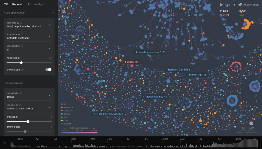 Cosmograph 非常适合需要快速、交互式和美观的图可视化的项目。Cosmograph 可以很好地扩展,使你能够在浏览器中渲染数十万个节点和关系。Cosmograph 在 CC BY-NC 4.0 公共许可证下免费提供给非商业用途,但对于商业用途,则需要专有许可证。