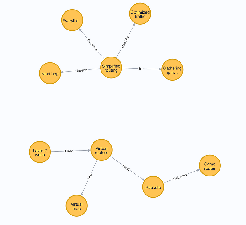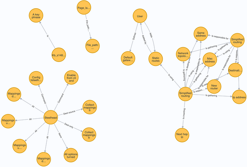 图 2 描绘了在使用 Deepseek-R1 摄取第一个知识库时生成的图谱。该图谱基本正确地反映了简化路由的知识,但'is using'关系存在错误,因为简化路由并不直接依赖于静态路由。右侧包含实体“简化路由”的图谱似乎已经很好地捕获了嵌入的知识,除了与实体“静态路由”的关系“正在使用”之外。此 SteelHead 功能并不直接依赖于静态路由的存在。